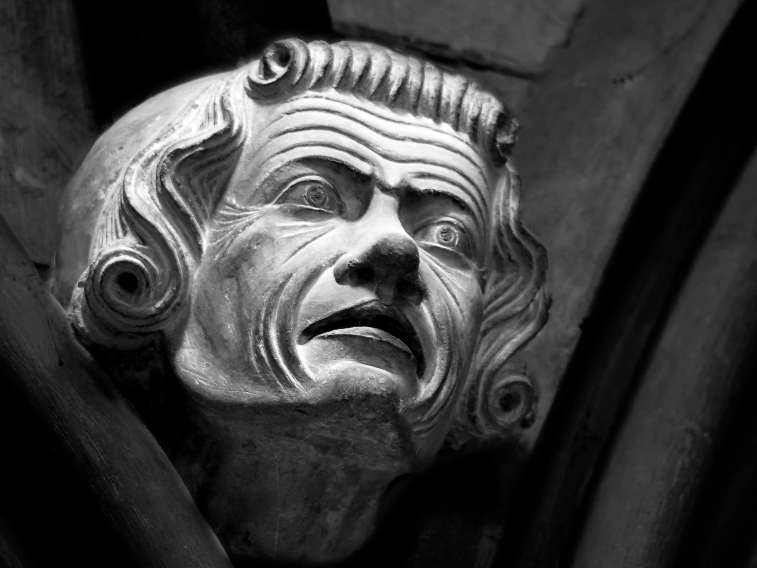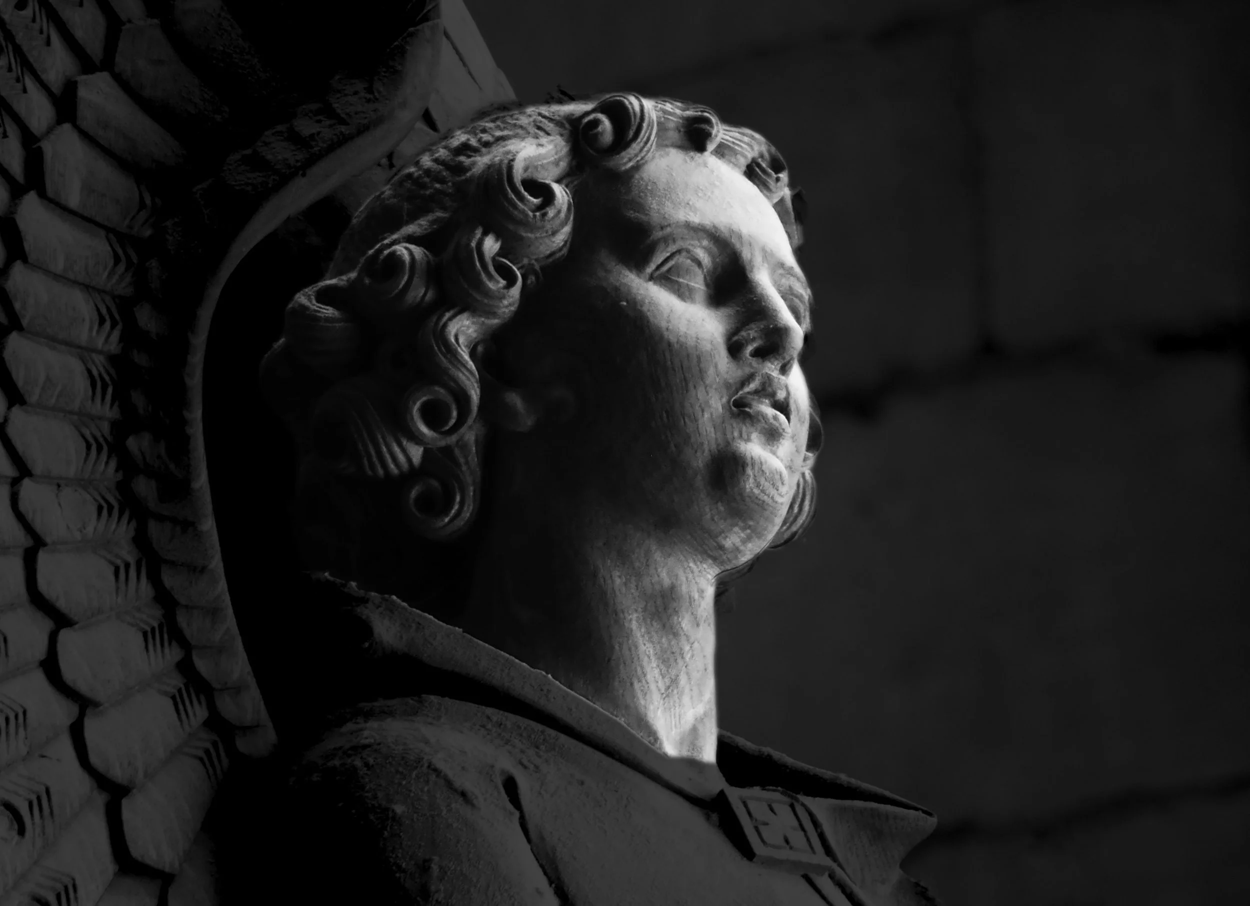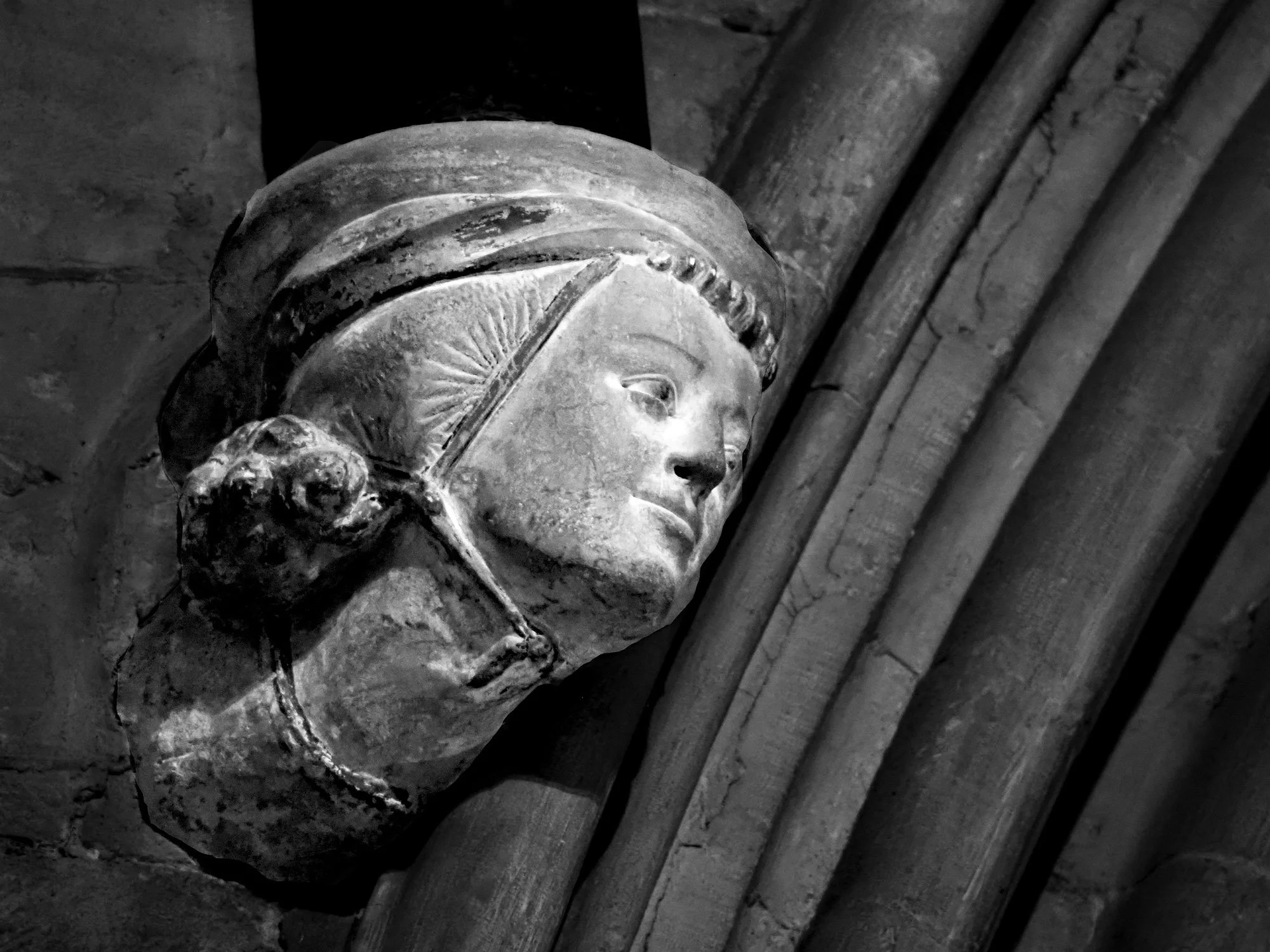 Visiting a cathedral I noticed the sculptured faces high in the vaulted ceiling. Different expressions, different genders, humans and other creatures. I became interested in the way these ‘portraits’ were given different characteristics, like actors in a play facing each other across the space. Most visitors will look up at the ceiling to view the decoration but will they see the faces of these stone players? The lonely queen, the stern king, the sad knight.